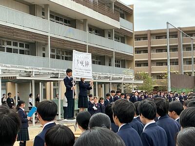 生徒会のスローガン発表も行われました。「声咲絆(こえさくきずな)」・一人一人の声が大切にされる、・生徒一人ひとりが大切にされる学校を、全学年でつくり上げていく。という意味が込められています。
