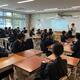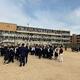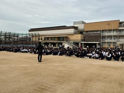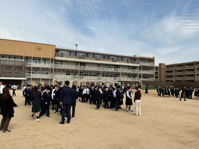 全校生徒が集合完了し防災担当の先生の話を聞いています。