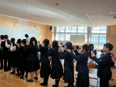 合唱部では、声を出す前のウォームアップを1年生も交えて行なっていました。