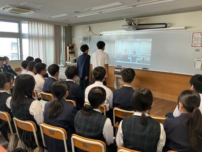 放課後、3年生の修学旅行事前学習の「平和」グループが長崎県にある活水高等学校平和学習部の部員とリモートで繋がり、質問を行うなど交流をさせていただきました。